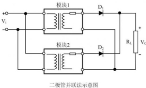 二極管并聯(lián)法如上圖所示:在模塊輸出端接二極管再并聯(lián),這種電源設(shè)計(jì)方案可以防止輸出電流逆流,形成內(nèi)環(huán)路。