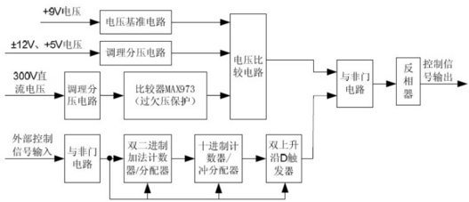 控制保護(hù)電路又分為控制以及過欠壓保護(hù)電路,控制電路用來對可控直流電壓的輸出進(jìn)行控制,過欠壓保護(hù)電路用來對三個(gè)DC-DC的過欠壓保護(hù)作用。