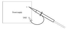 示波器是測試電源紋波噪音的工具,在測試中如何選擇探頭、帶寬、采樣率、耦合方式及接地都會對測試結(jié)果有所影響。一般的測試方法有甩線測試法、平行線測試法及靠測法等,甩線測試法如下圖所示: