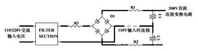 上圖所示為串連電阻法沖擊電流控制電路(適用于橋式整流和倍壓電路,其沖擊電流相同),對于110V、220V雙電壓輸入電路,應(yīng)該在R1和R2位置放兩個(gè)電阻,這樣在110V輸入連接線連接時(shí)和220V輸入連接線斷開時(shí)的沖擊電流一樣大。對于單輸入電壓電路,應(yīng)該在R3位置放電阻。