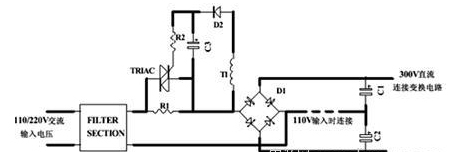 有源沖擊電流限制電路 (橋式整流時(shí)的沖擊電流大),在電路在剛啟動(dòng)時(shí),沖擊電流被電阻R1限制,當(dāng)輸入電容充滿電后,有源旁路電路開始工作將電阻R1旁路,這樣在穩(wěn)態(tài)工作時(shí)的損耗會變得很小。在這種可控硅啟動(dòng)電路中,很容易通過開關(guān)電源主變壓器上的一個(gè)線圈來給可控硅供電,由開關(guān)電源的緩啟動(dòng)來提供可控硅的延遲啟動(dòng),這樣在電源啟動(dòng)前就可以通過電阻R1將輸入電容充滿電。