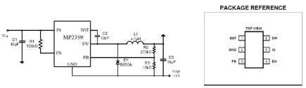 上圖是采用MP2359DT設(shè)計的-15V電源電路,MP2359DT是采用SOT23-6的封裝,整個電路占用PCB面積較小。