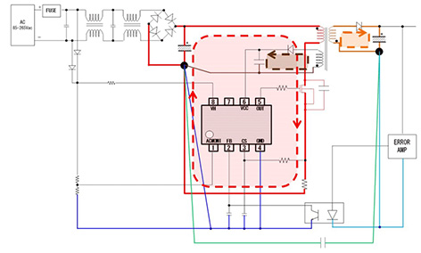 紅色線是大電流路徑,是發(fā)生振鈴或損耗主因,應(yīng)盡量粗盡量縮短。此外,紅色線的環(huán)路盡量縮小。二次側(cè)的橙色線和紅色線相同盡量粗盡量縮短、環(huán)路盡量縮小。褐色線是電流流向VCC引腳的路徑,開關(guān)時流通電流,故須個別配線。變壓器的正下方會受到磁通影響,不可經(jīng)過IC控制信號線。紅色線、褐色線、藍(lán)色線、緑色線的GND應(yīng)有一點(diǎn)接地。緑色線是二次側(cè)的浪涌流向一次側(cè)的路徑,會瞬間流過大電流,因此在紅色線和藍(lán)色線之外個別配線。藍(lán)色線是IC控制信號用GND線,不會流過大電流,但容易受到噪聲影響,因此須在紅色線、綠色線、褐色線之外另行配線。