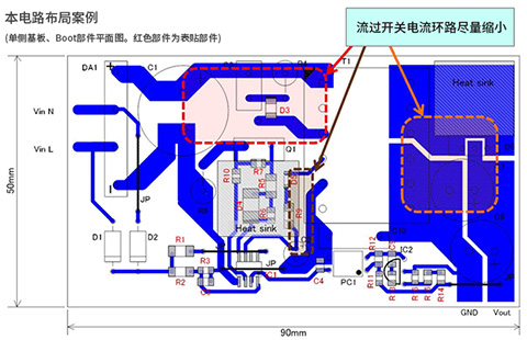 開關(guān)電源模塊利用開關(guān)的ON/OFF來控制電壓,但依然屬于模擬電路。雖然本身會發(fā)出高頻噪聲,但因擁有反饋環(huán)路,對噪聲非常敏感。也就是說,開關(guān)電源電路的路徑,必須考慮分成大電流ON/OFF后產(chǎn)生噪聲的路徑,以及對噪聲非常敏感的控制信號路徑?;迮渚€布局,大電流路徑應(yīng)避免產(chǎn)生噪聲,控制信號路徑應(yīng)避免受到噪聲影響。當(dāng)然,這種噪聲屬于輻射噪聲,也會對EMC造成影響,因此布局必須極力避免產(chǎn)生噪聲。